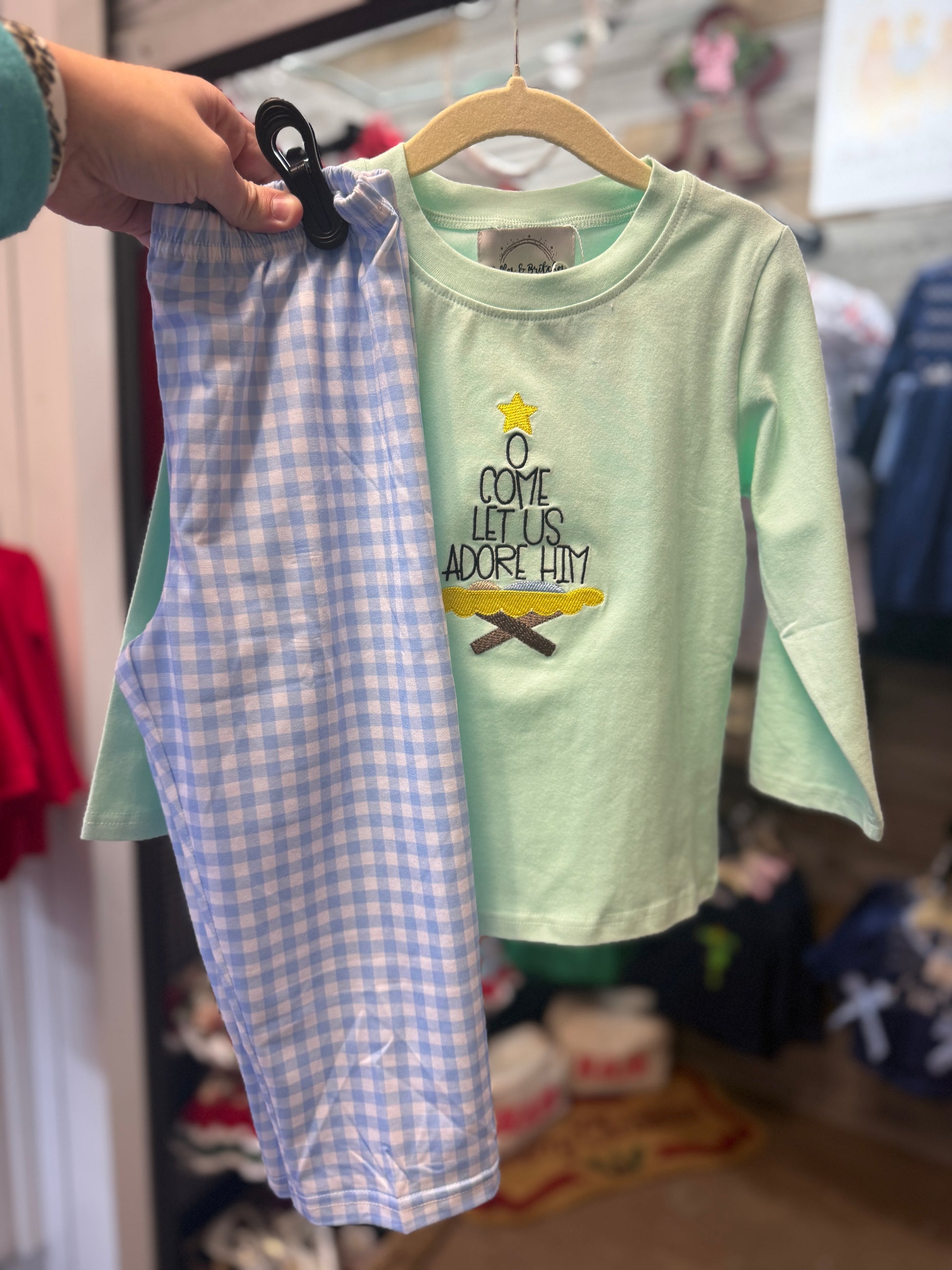 Adore Him sibling set, Christmas sibling outfits, faith-based kids clothing, O Come Let Us Adore Him outfit, manger applique shirt, religious Christmas outfit, boy girl matching Christmas set, blue checkered pant set, ruffle Christmas outfit, boutique holiday outfits, Belles and Britches Boutique