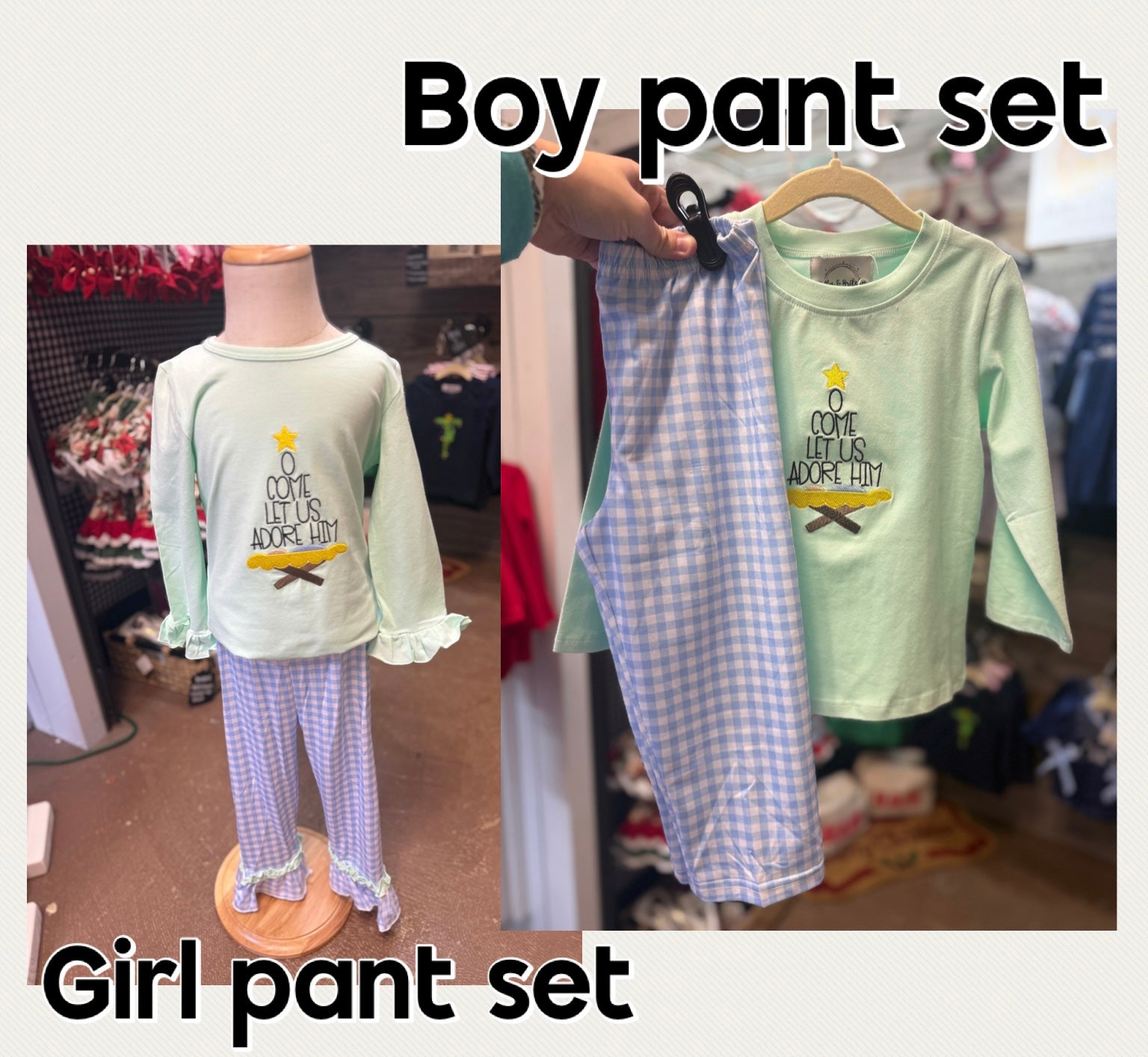 Celebrate the true meaning of Christmas with our Adore Him Sibling Collection. This precious set features both boy and girl pant options with a beautiful mix of embroidery and appliqué reading “O Come Let Us Adore Him”, complete with a shining star and manger design. The coordinating blue checkered pants tie the look together — with sweet ruffles for the girls. A timeless and meaningful holiday look for brothers and sisters to match in!