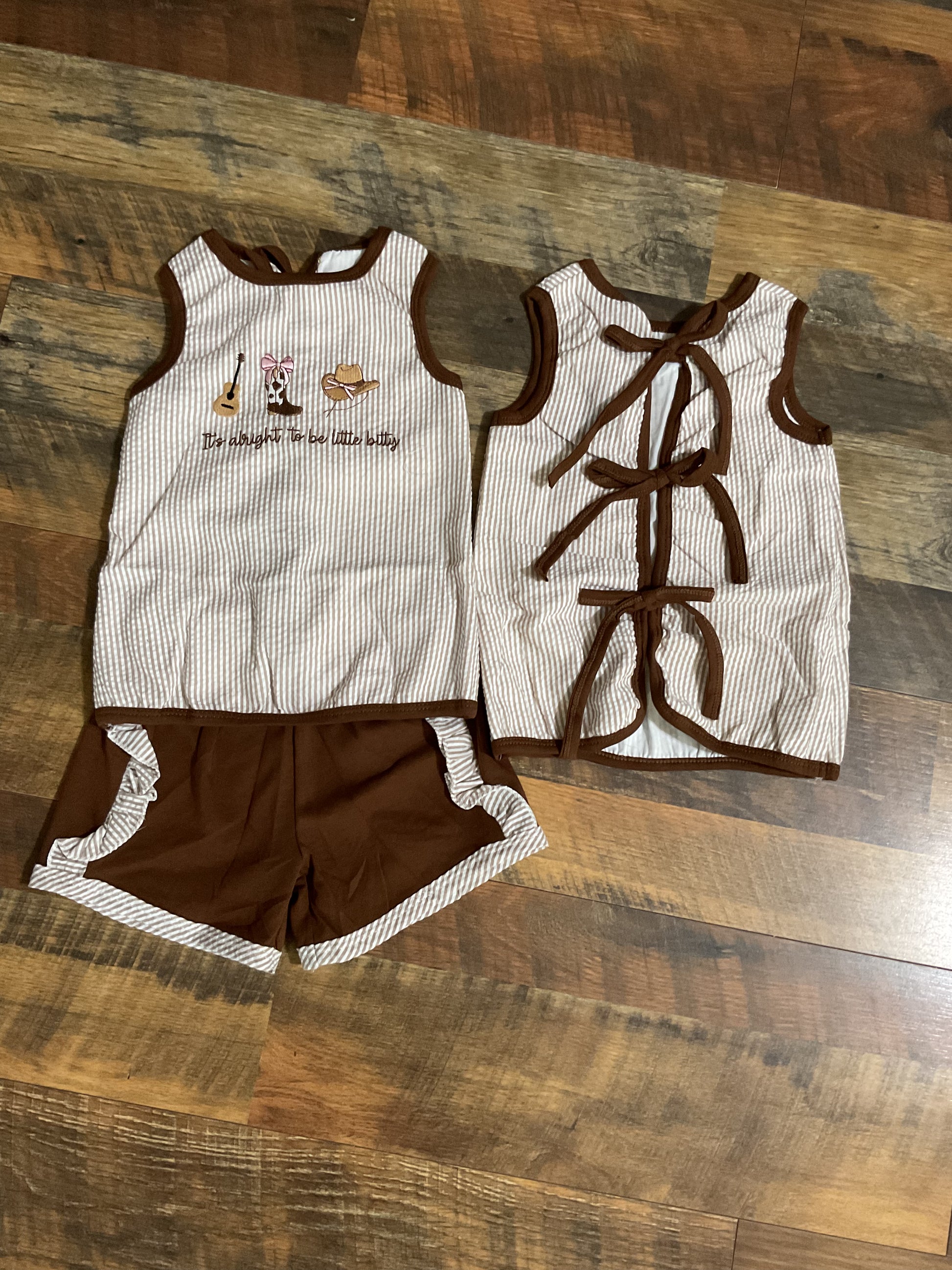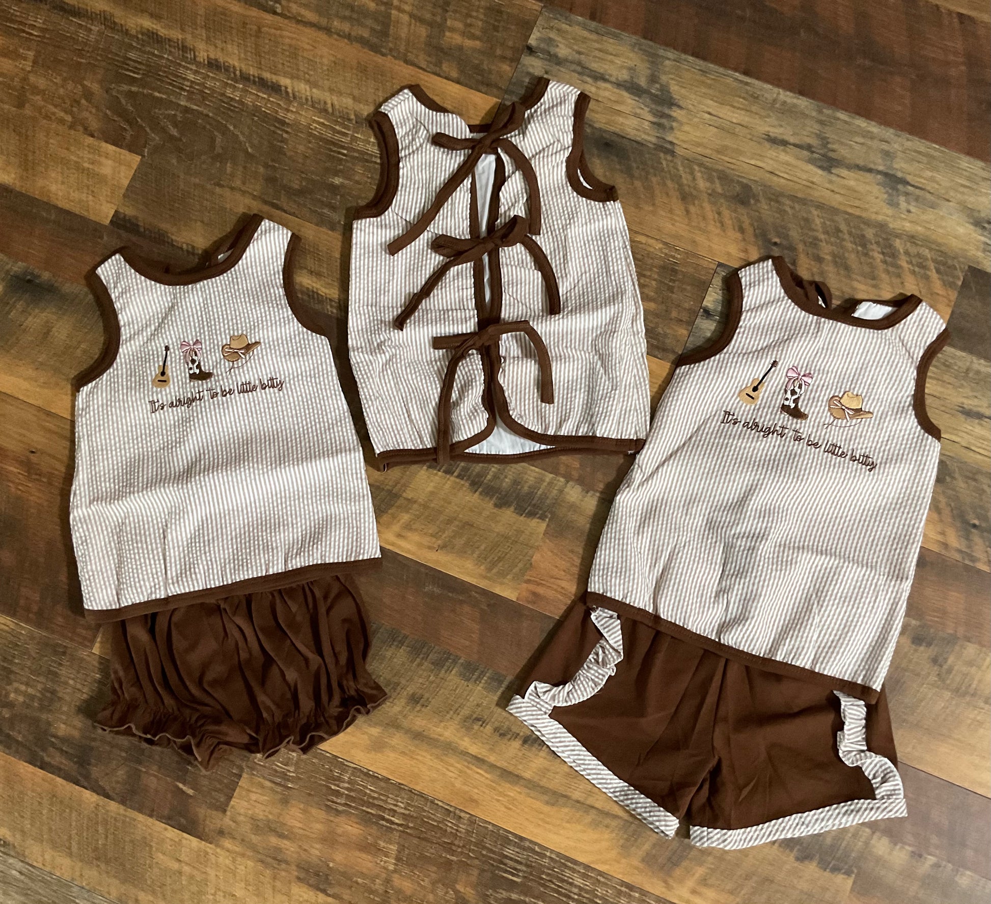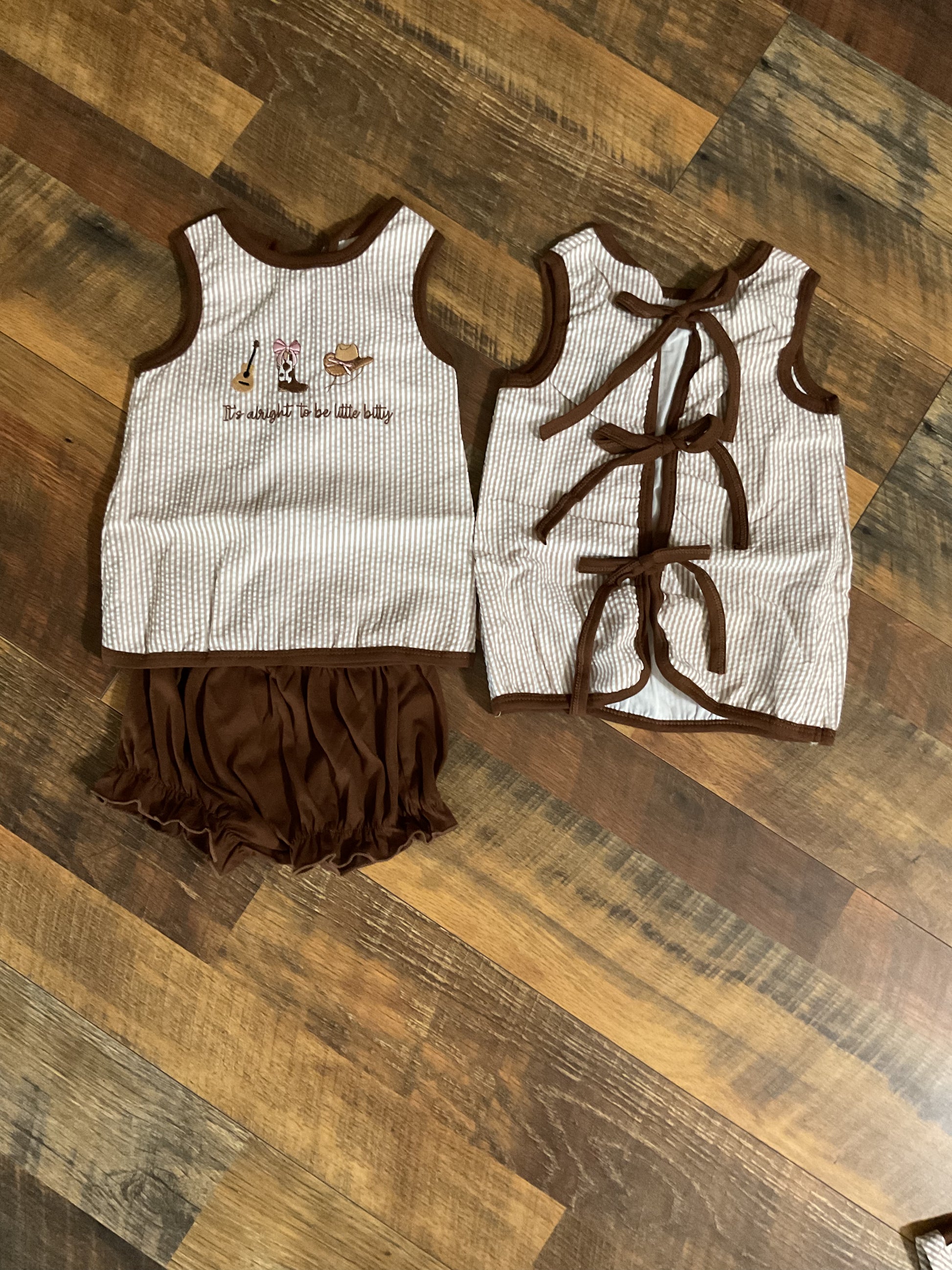 girl bloomer set, girl short set, country girl outfit, toddler cowgirl outfit, baby girl fall outfit, embroidered girl set, it’s alright to be little bitty outfit, brown and white striped top, cowgirl baby clothes, boutique girl outfit, southern baby outfit, little bitty girl collection, guitar boot hat embroidery, cute toddler clothes, baby girl boutique set