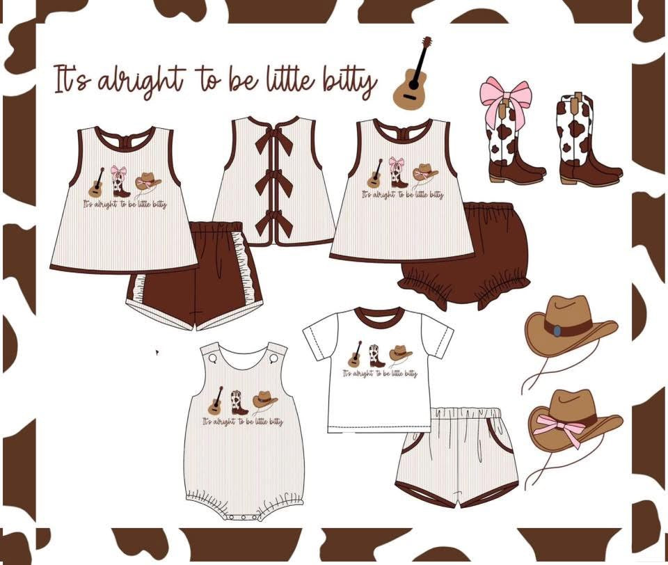 Let her show off her country charm in our adorable Alright To Be Little Bitty girl sets! This sweet collection features a soft, striped top with rich brown bloomers or shorts, perfect for little ones who love a southern vibe. The front is beautifully embroidered with the phrase “It’s alright to be little bitty”, along with a cute guitar, a cowgirl hat with a bow, and a matching boot with a bow. Whether she’s at a fall festival or just twirling in the yard, she’ll be comfy and picture-ready in this darling outfit. Comfort meets cuteness in this boutique-style look that’s made for little country girls with big personalities.