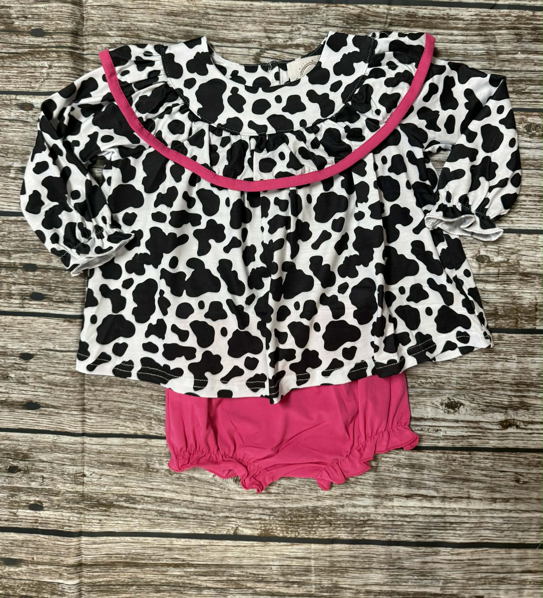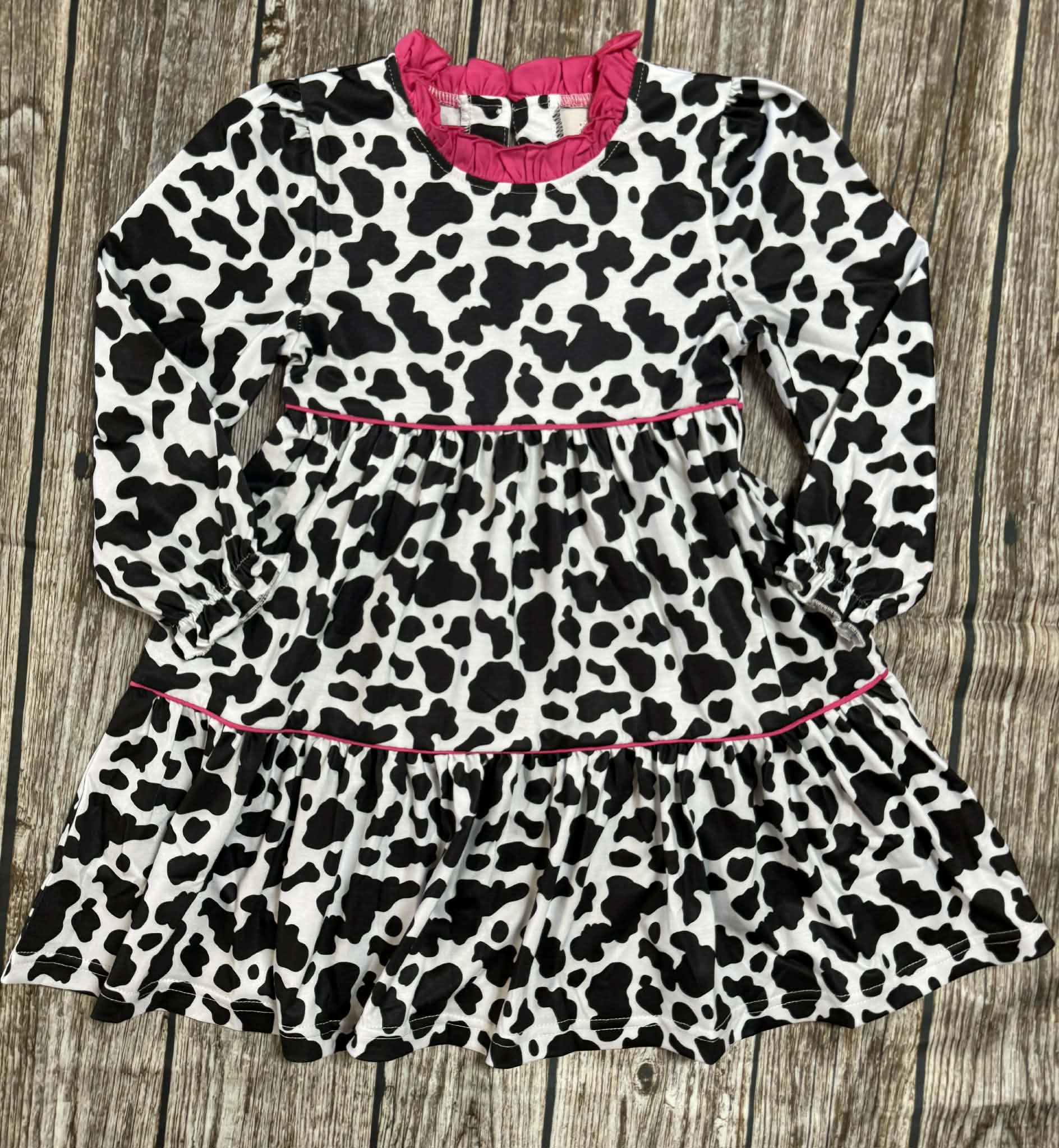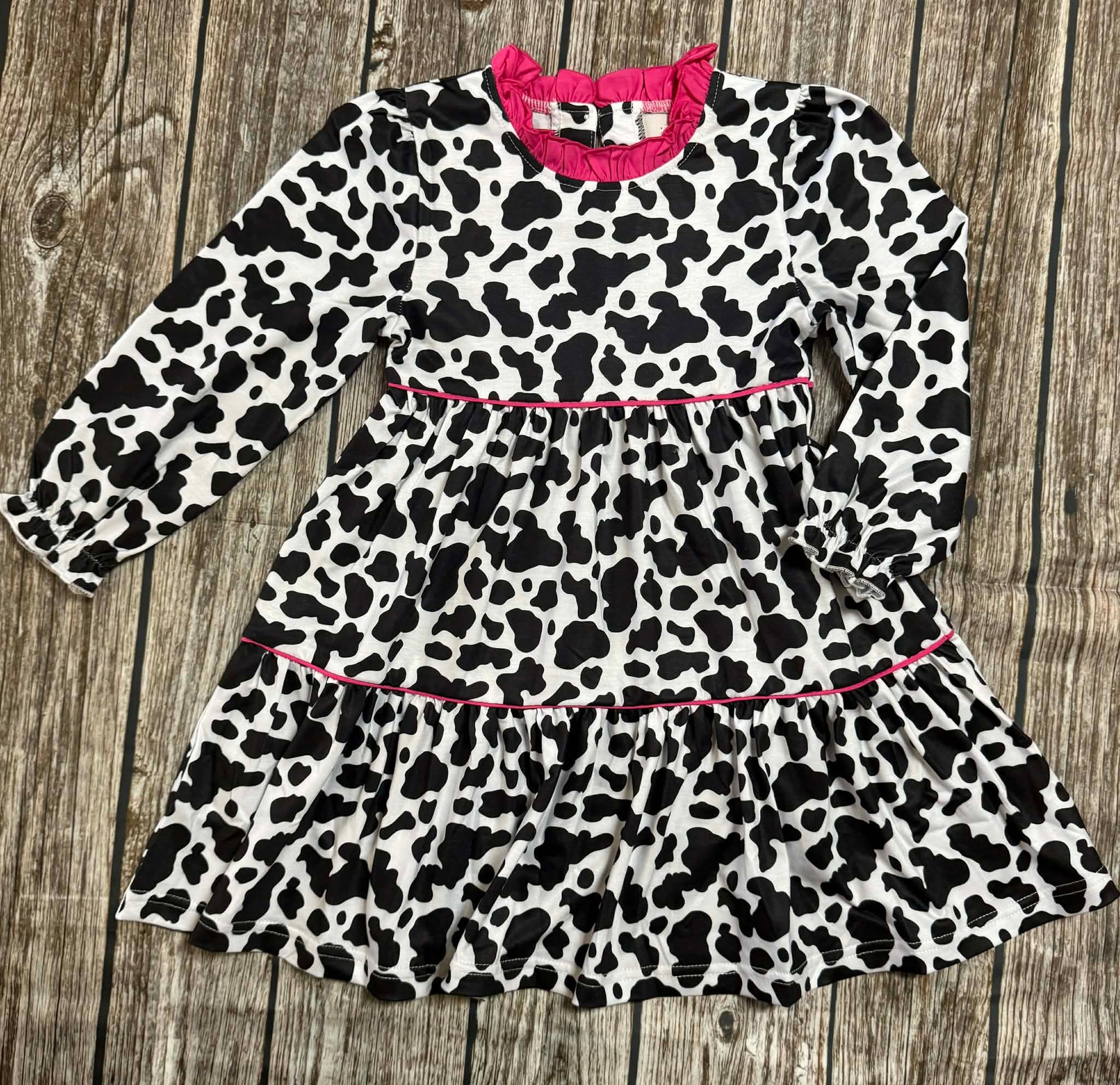 girls cow print dress, sister matching outfit, boutique girls long sleeve dress, cow print bloomer set, hot pink trim dress, toddler girls dress set, boutique girls outfit, playful girls clothing, cow print boutique clothing, boutique girls bloomers
