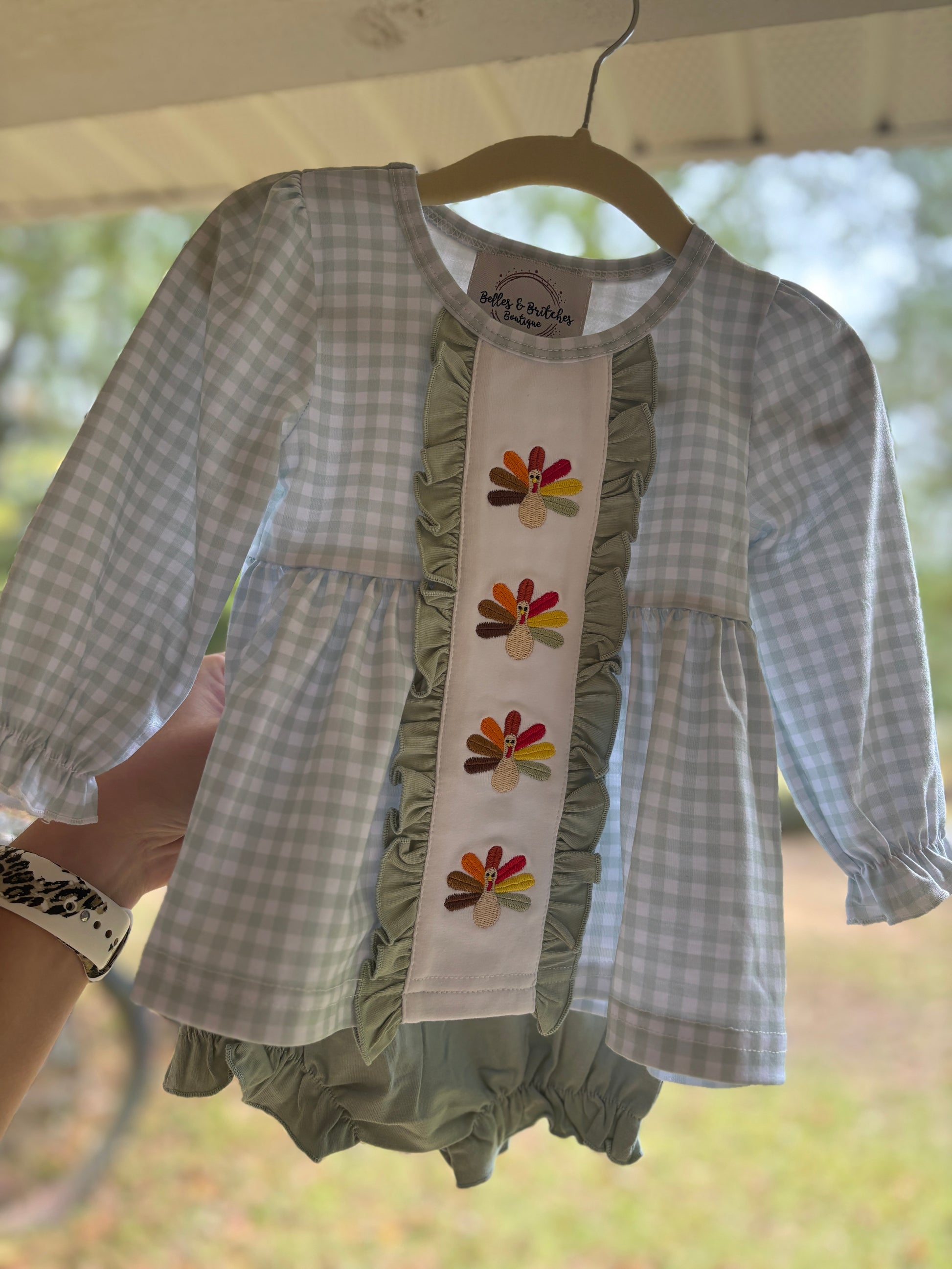thanksgiving outfit, fall kids clothing, turkey applique, sage plaid outfit, gingham outfit, fall sibling set, girl bloomer set, boy bubble, girls thanksgiving dress, boutique thanksgiving outfit, long sleeve thanksgiving outfit, ruffle thanksgiving outfit, matching sibling thanksgiving outfits, autumn kids clothes, gingham gathering collection