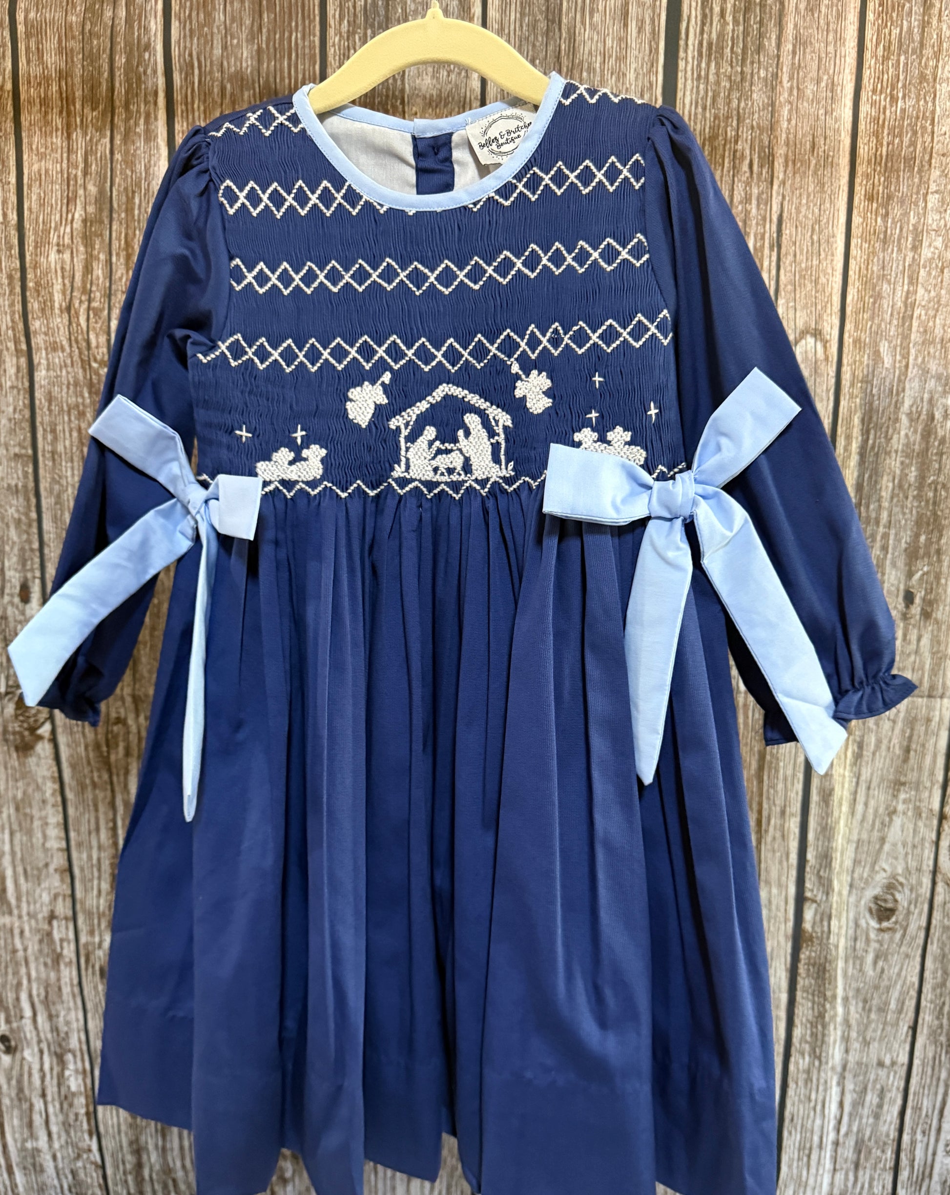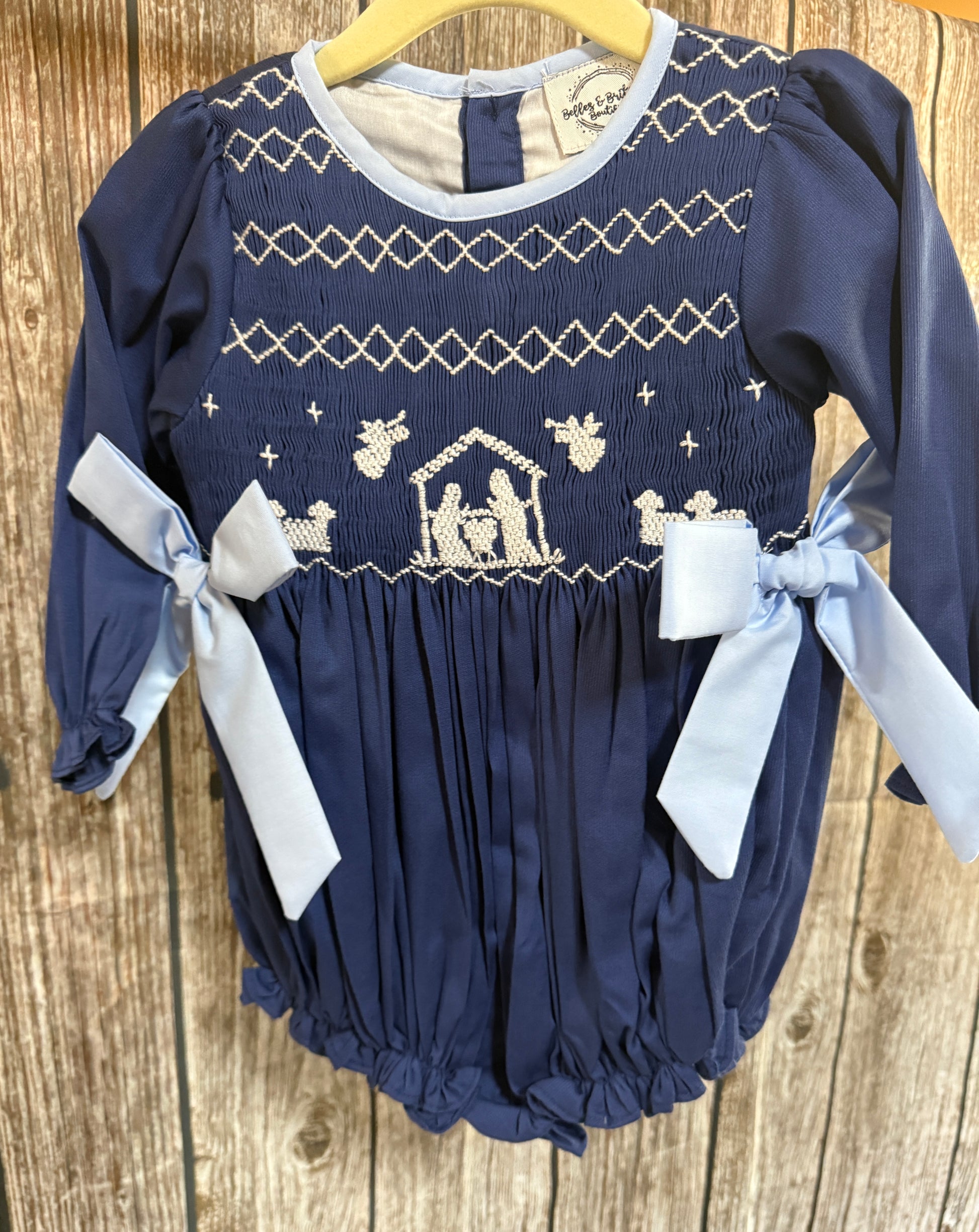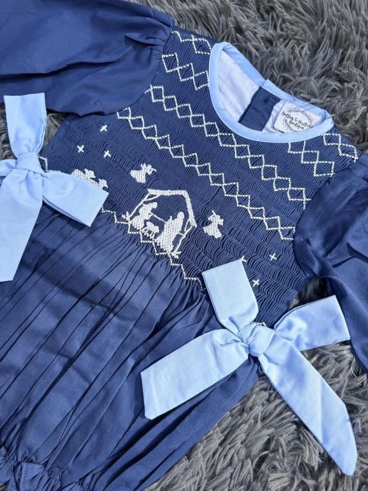 Celebrate the true meaning of Christmas with our Glory To The King Hand Smocked Dress and Bubble. This stunning design features a beautifully detailed manger scene hand-smocked across the chest, symbolizing the spirit of the season. Crafted in deep blue with light blue trim and faux side bows, the long sleeves add warmth and elegance for winter festivities. Perfect for church services, nativity programs, and timeless holiday photos. Available in both a classic dress and a matching bubble for the sweetest sibling look.