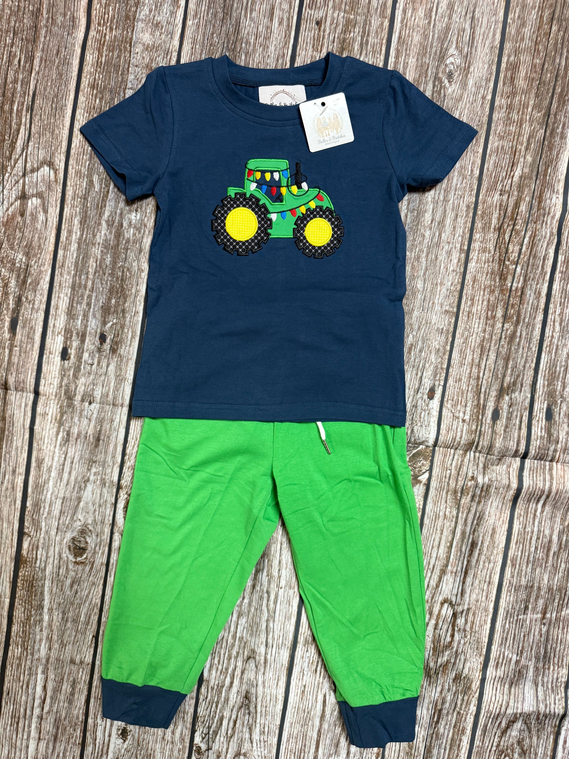 holiday harvest outfit, green tractor christmas set, boys christmas tractor outfit, tractor applique shirt, jogger pants christmas boy, toddler boy christmas jogger set, boys holiday bubble, farm christmas outfit boy, tractor christmas embroidery, boutique christmas clothing boy, christmas farm tractor outfit