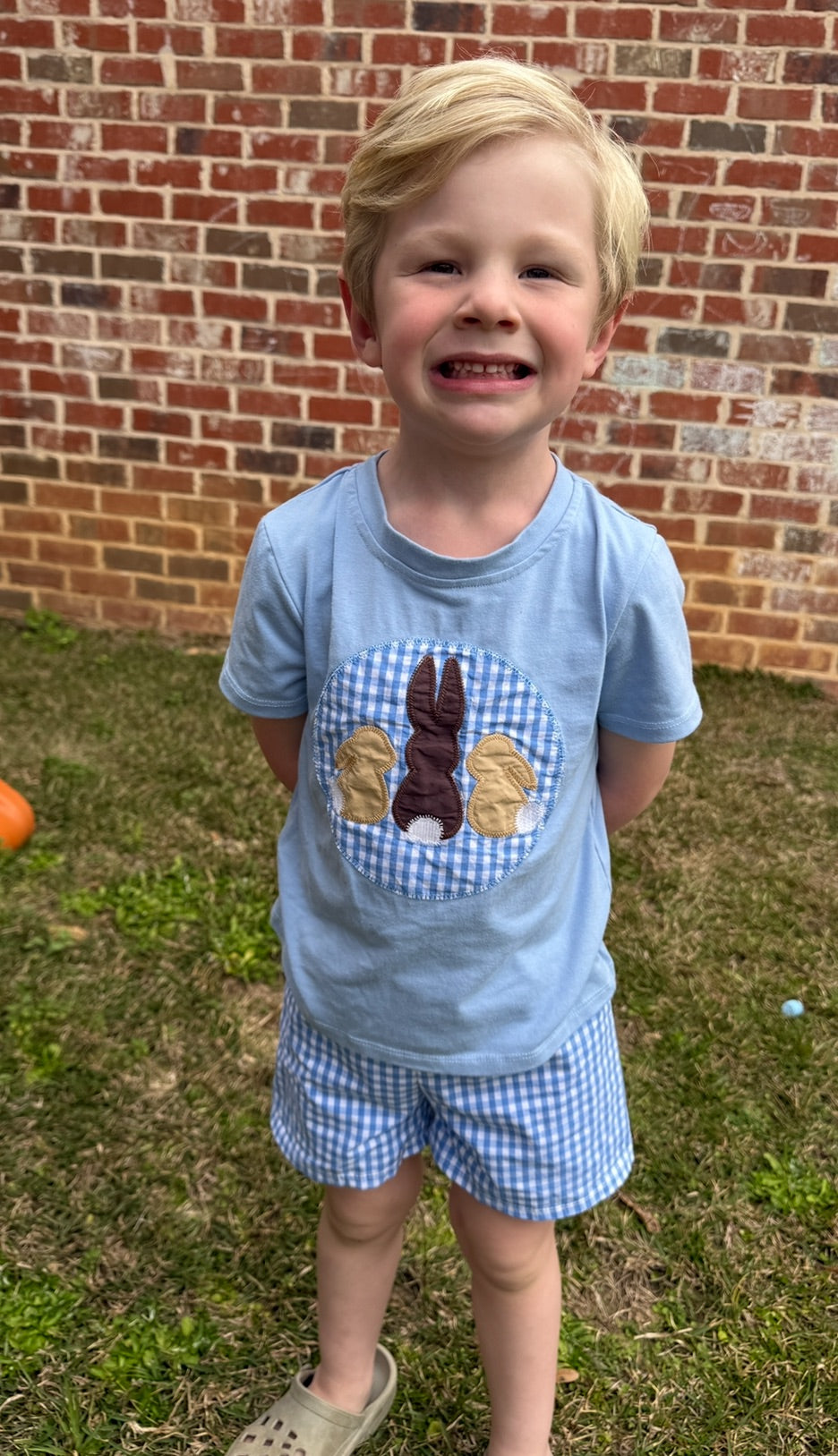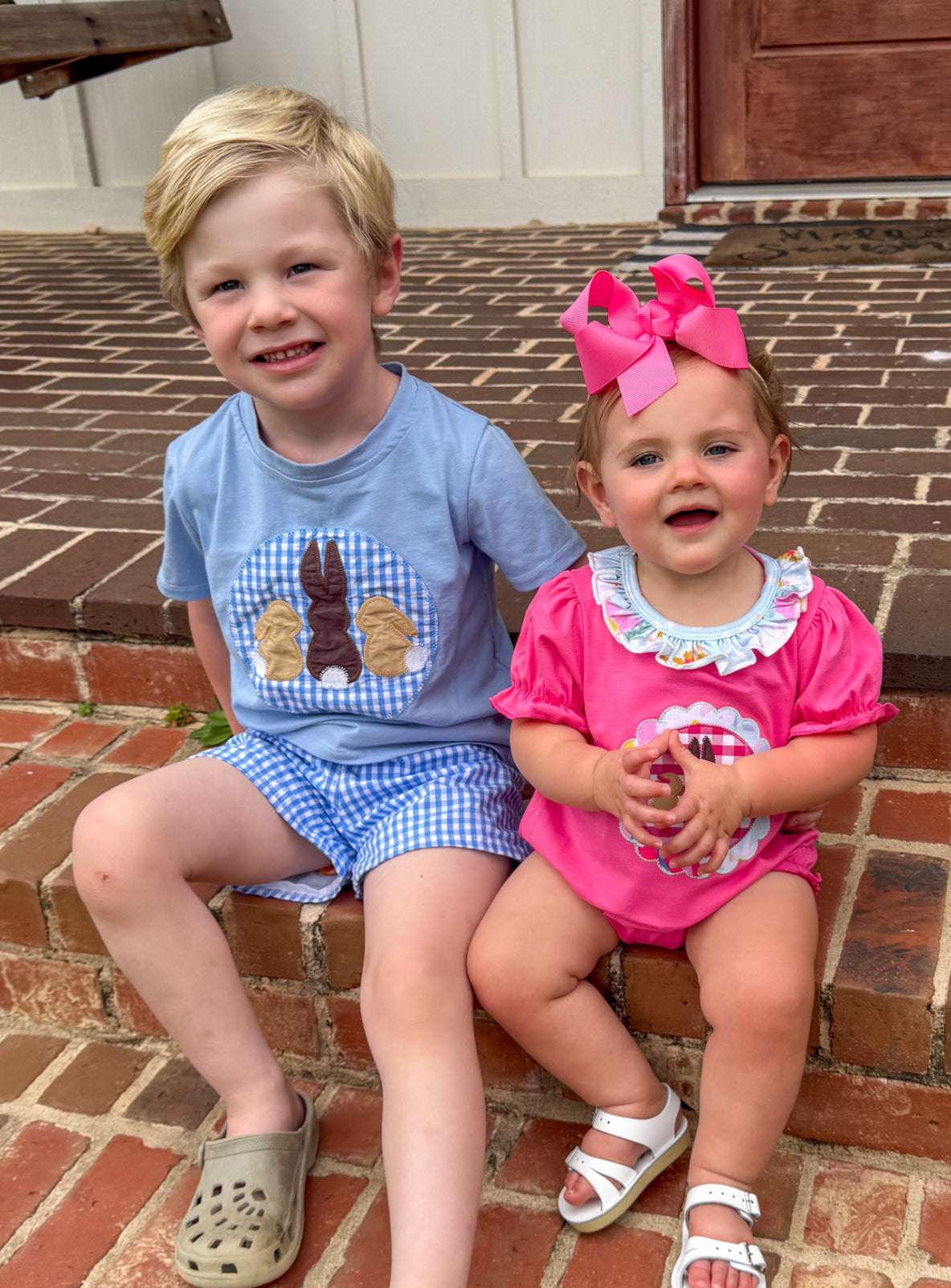 Short Set or Diaper Cover: This sibling boy match is blue with the same three bunnies appliquéd. A stripe background in a different shade of blue that matches the shorts is adorable and perfect for Easter.