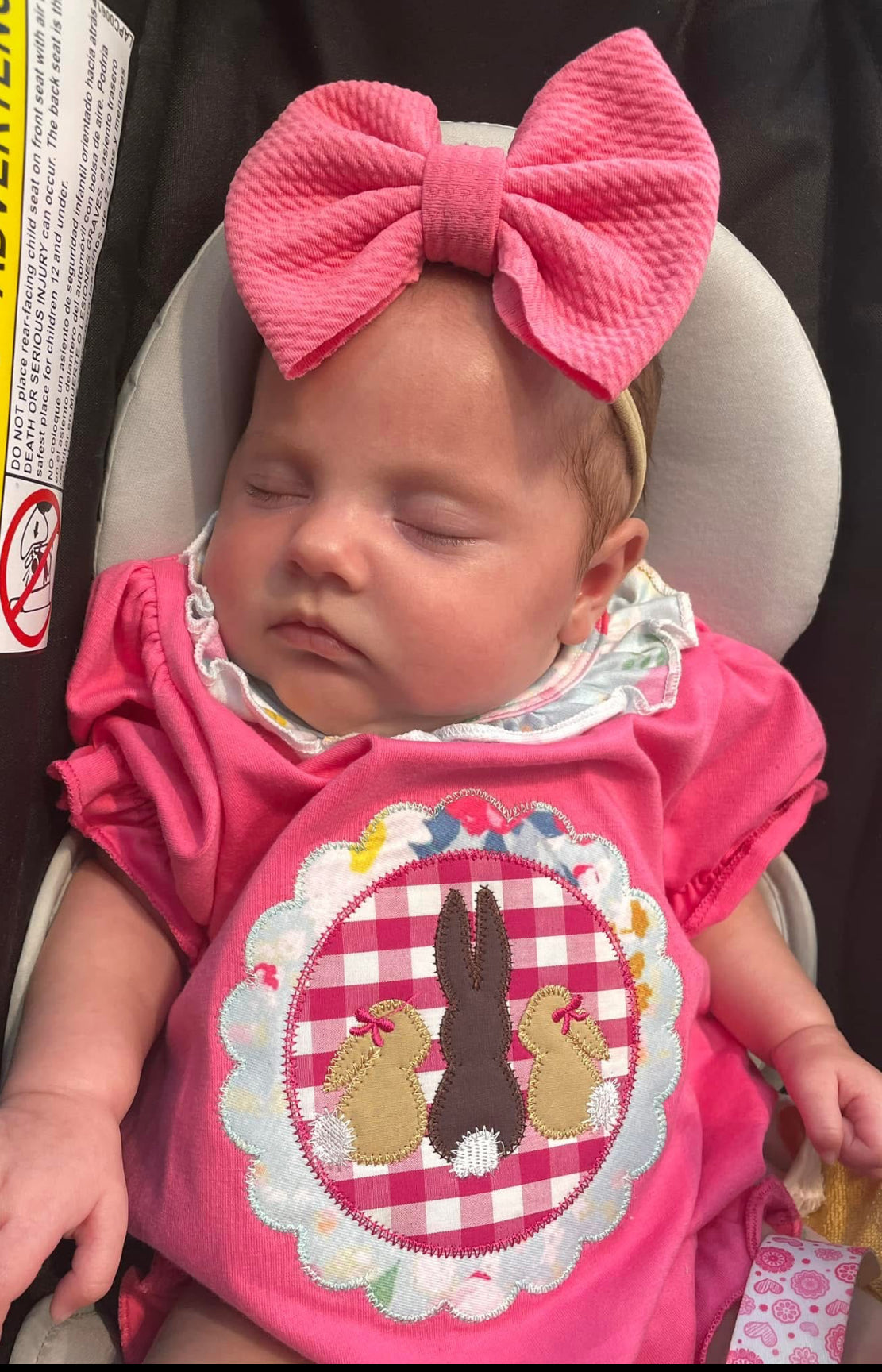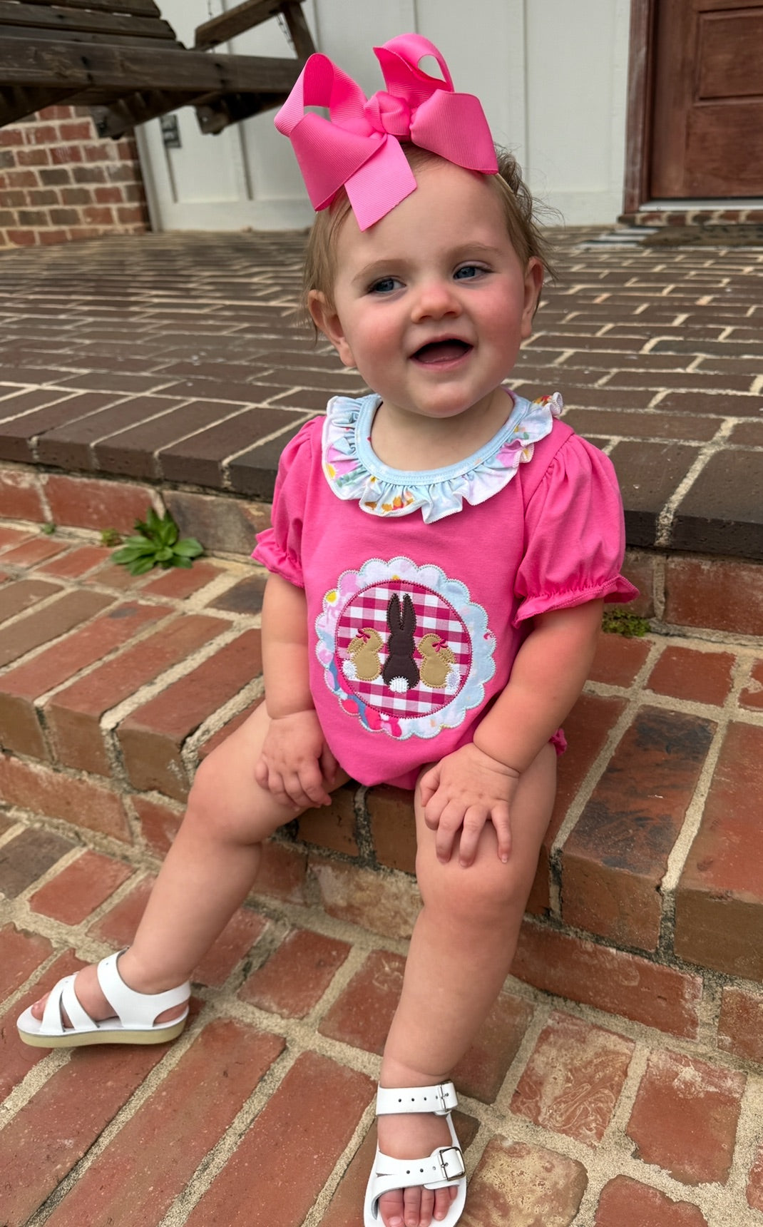 Girl Bubble or Dress: pink short sleeve applique design with the cutest three bunnies. A printed ruffle trim adds just the perfect balance to make this so cute for Easter.