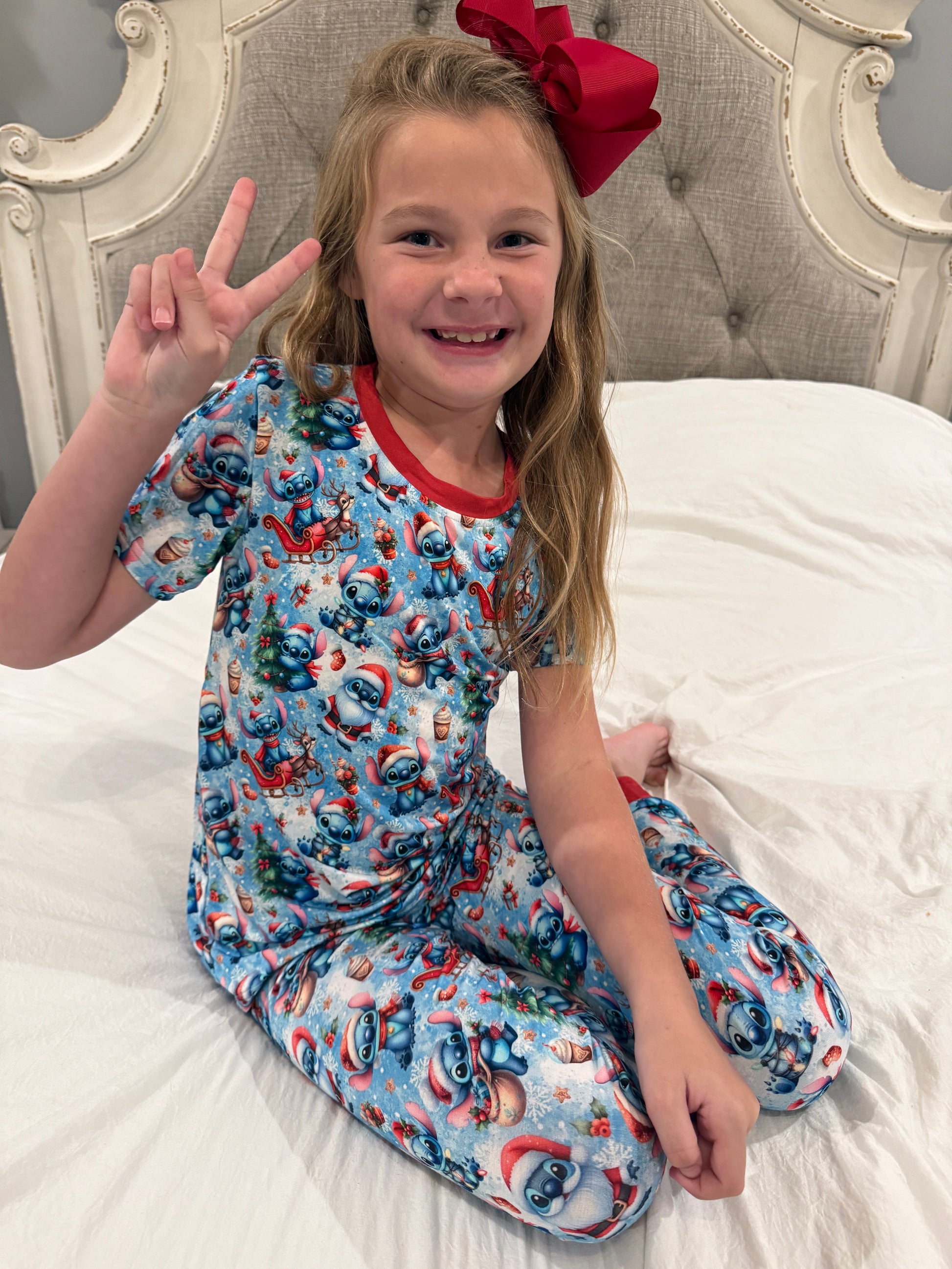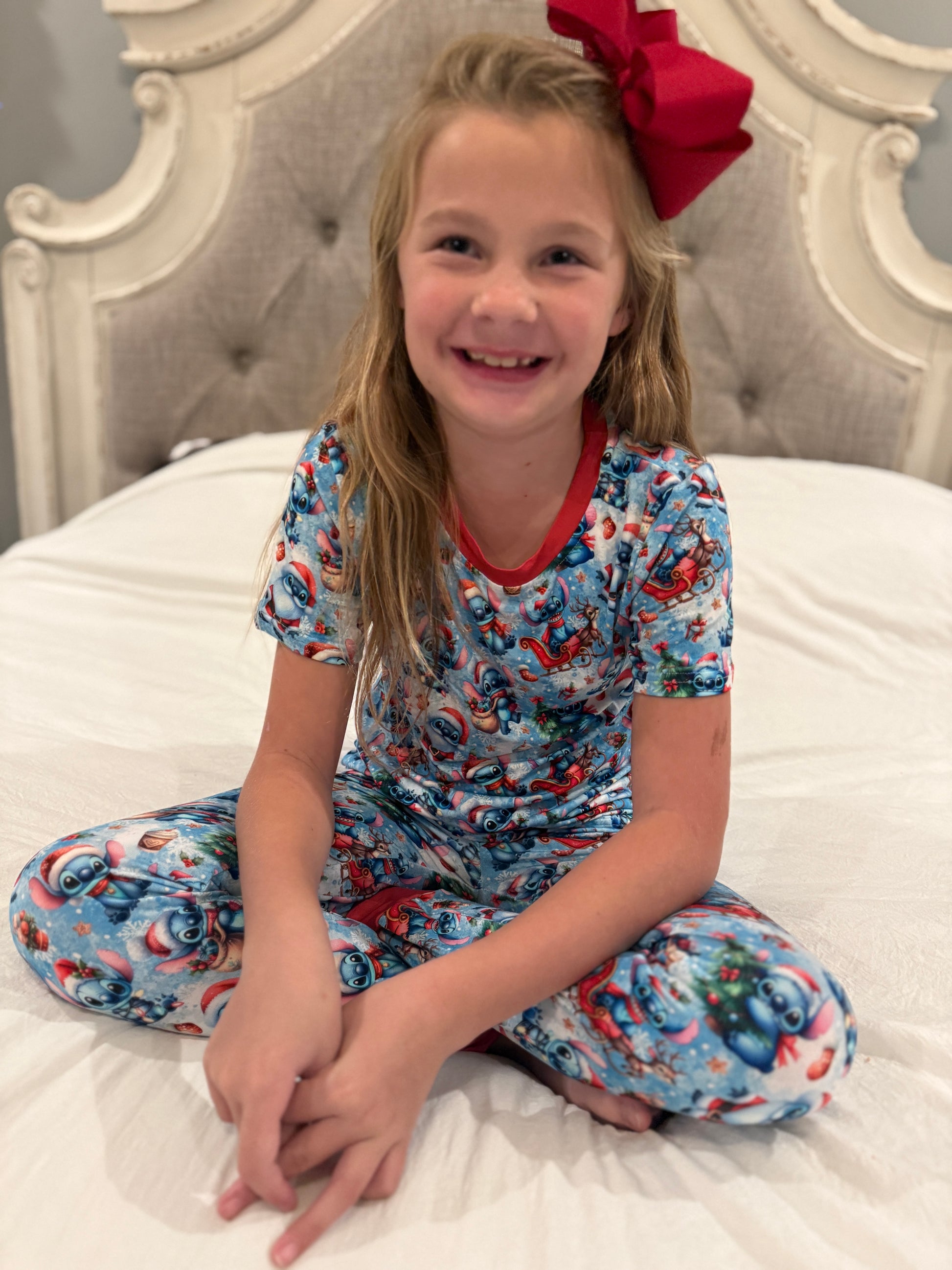 holiday character pajamas, blue Christmas bamboo set, festive cartoon Christmas outfit, unisex holiday pajama set, bamboo kids Christmas pajamas, toddler Christmas sleepwear, snowy blue Christmas outfit, cozy holiday bamboo set, kids winter pajama set, Christmas cartoon print