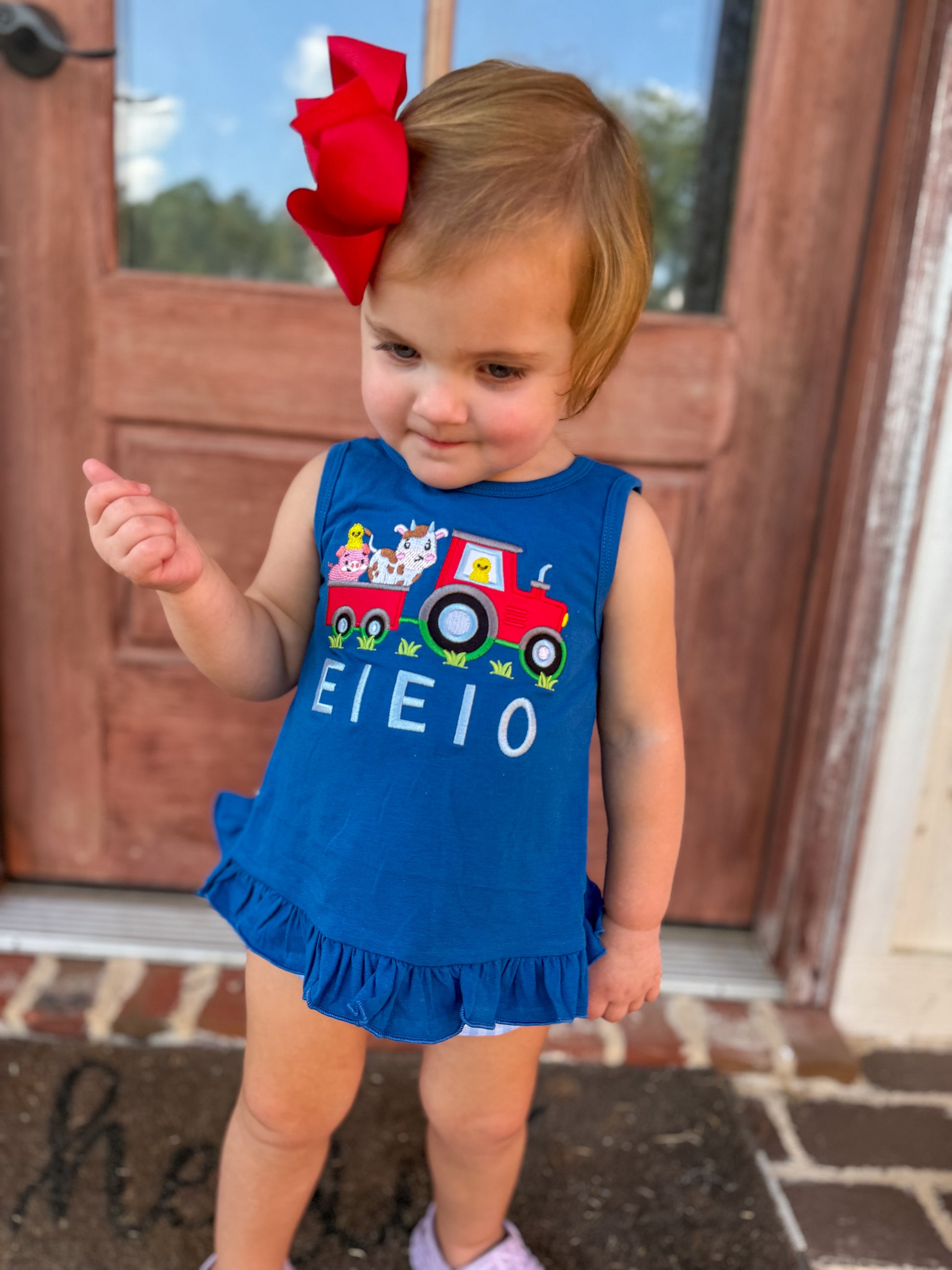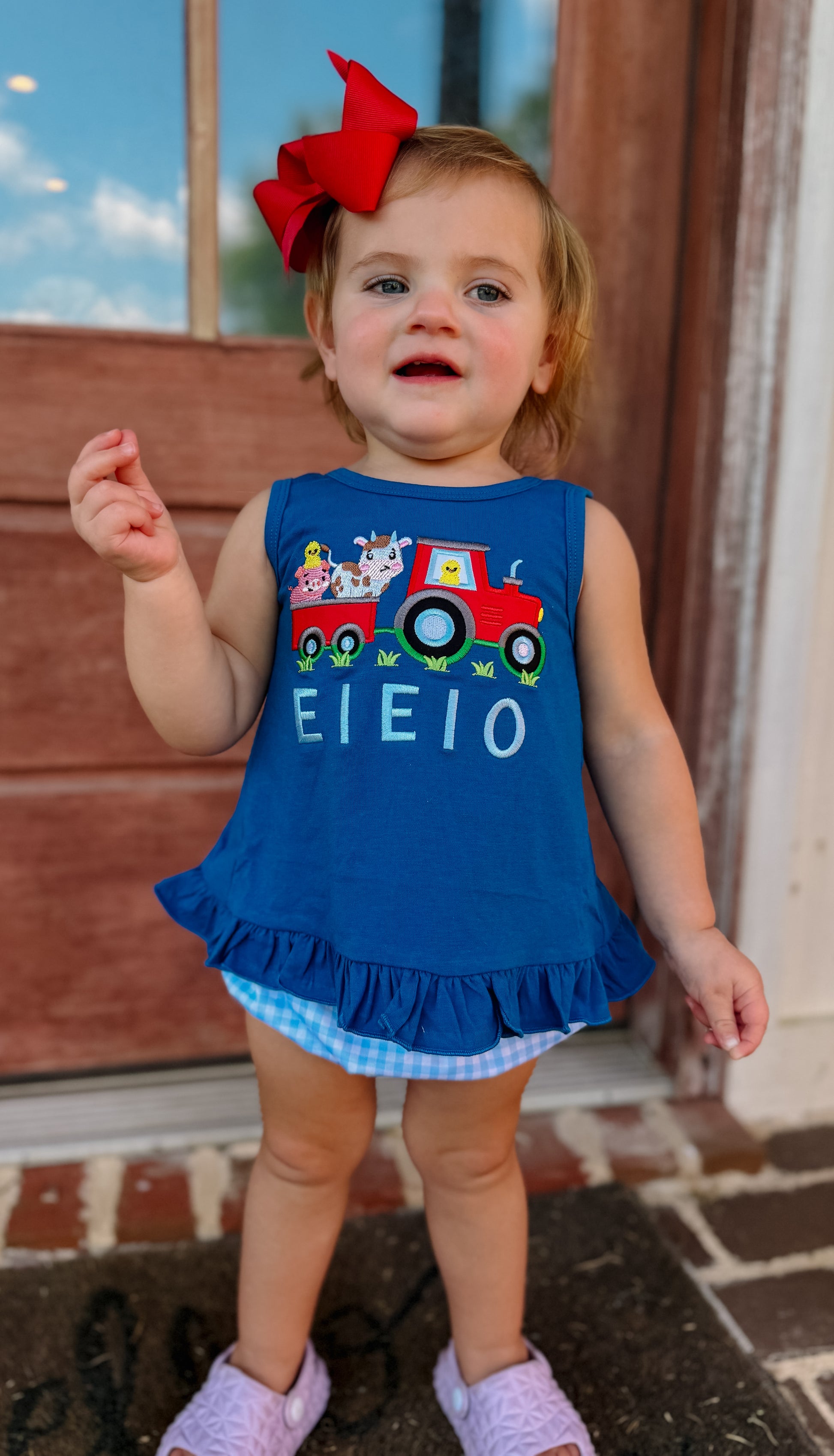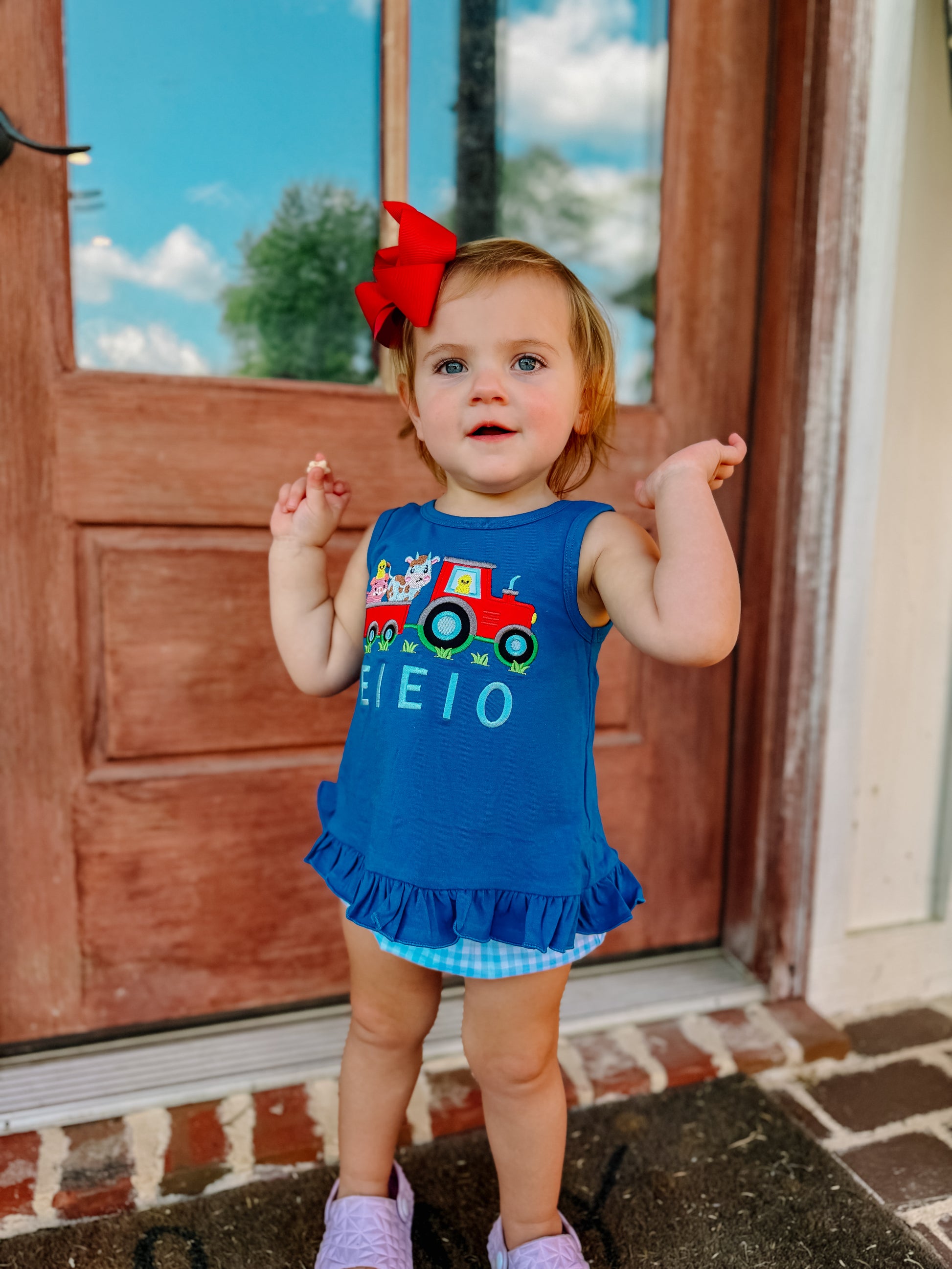 farm animal outfit, old mcdonald clothing, tractor kids outfit, pig cow duck outfit, sibling farm matching set, boy farm outfit, girl farm bloomer set, navy farm shirt, summer sibling sets, barnyard baby clothes, toddler tractor outfit, blue plaid shorts, bow back farm top, farm theme toddler clothes, EIEIO kids outfit