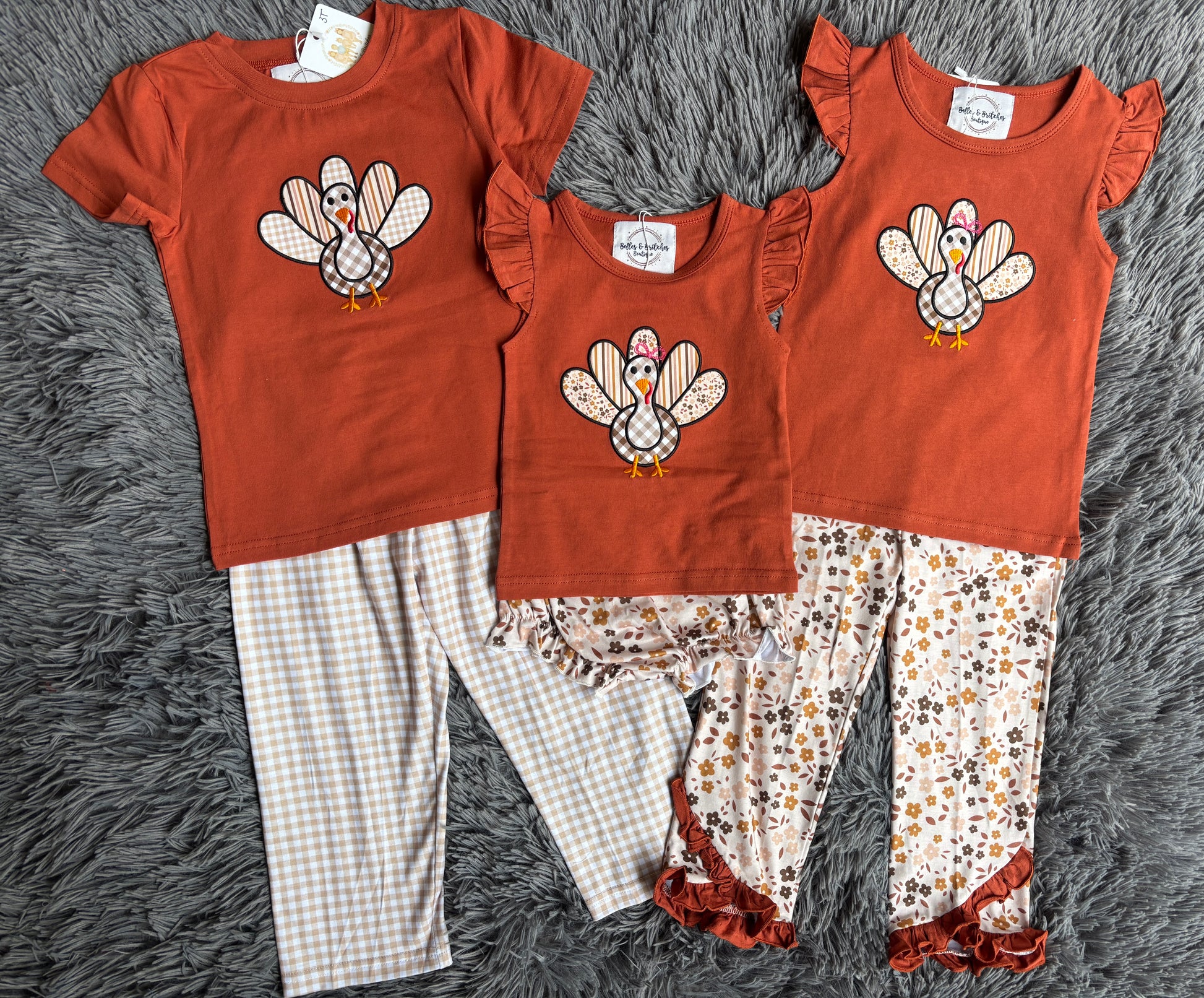 Our Patchwork Blessings collection is full of fall charm and thankful hearts! This adorable set includes a girl bloomer set and coordinating boy and girl pant sets, all featuring a cheerful appliqué turkey on the front. Designed with cozy fall colors and playful patchwork details, it’s the perfect outfit for celebrating Thanksgiving, family photos, or fall festivities in comfort and style.