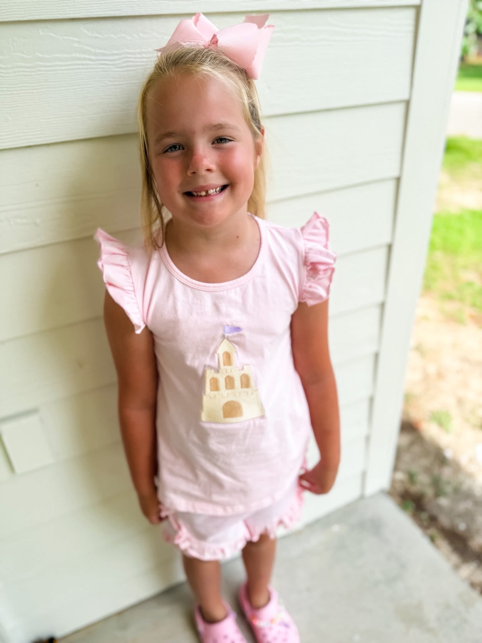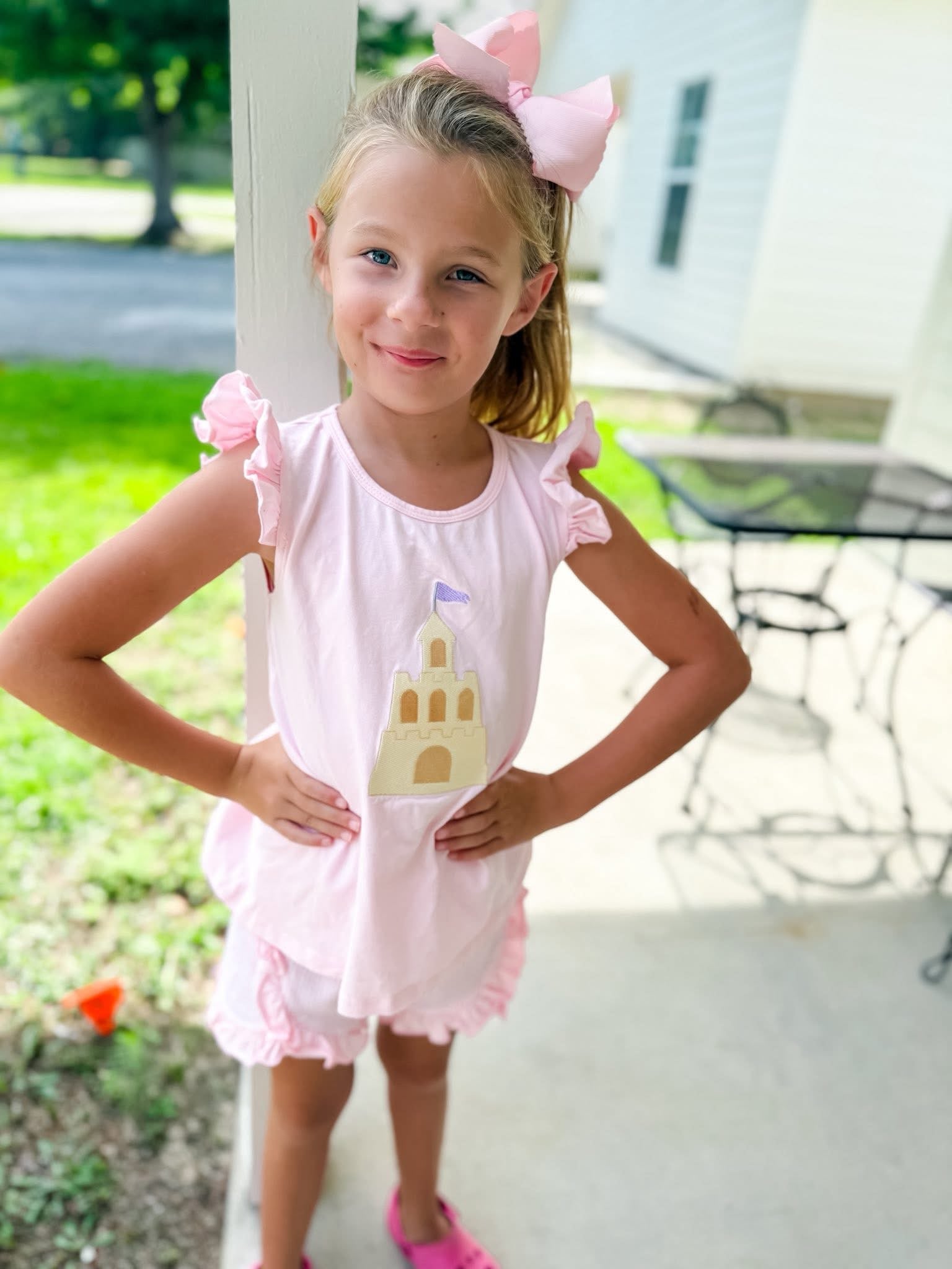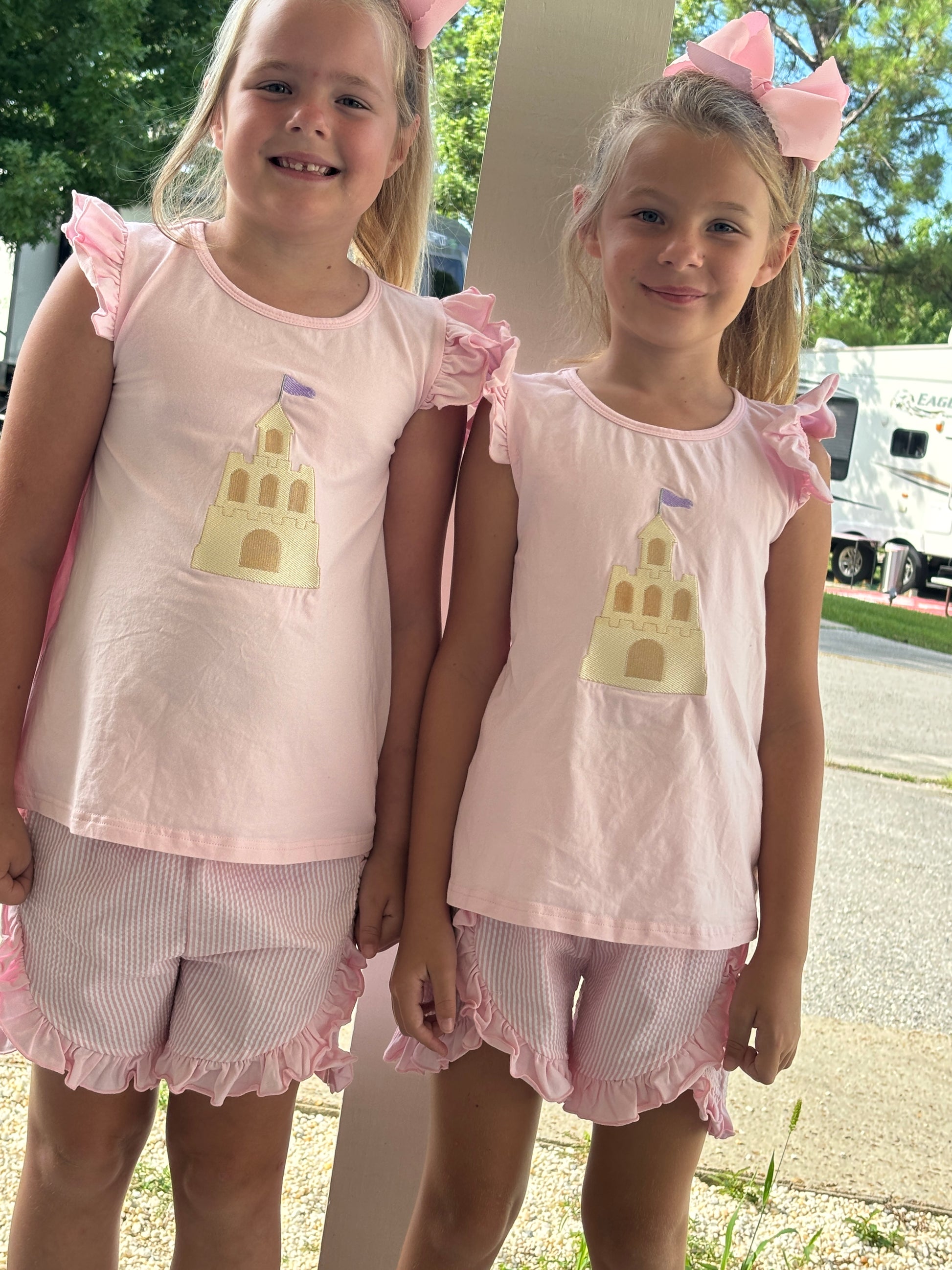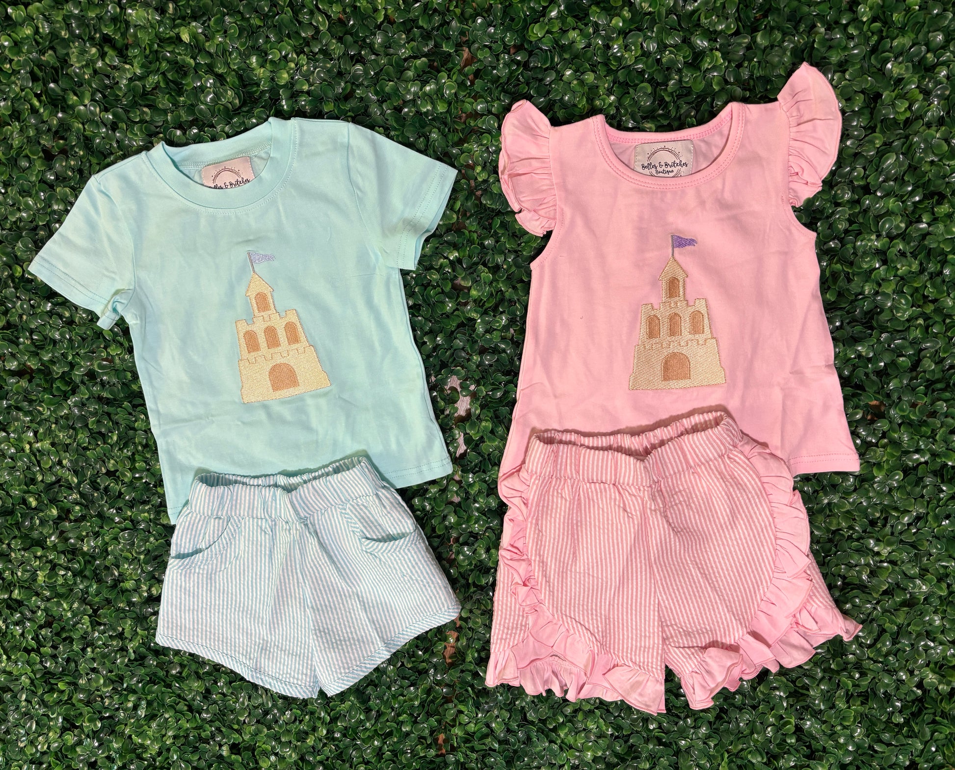 sandcastle outfit, beach outfits for kids, toddler beach clothes, boys summer outfit, girls ruffle shorts set, embroidered kids clothing, beach vacation outfit, kids summer matching sets, toddler sandcastle shirt, sibling matching beach outfits, kids coastal clothing