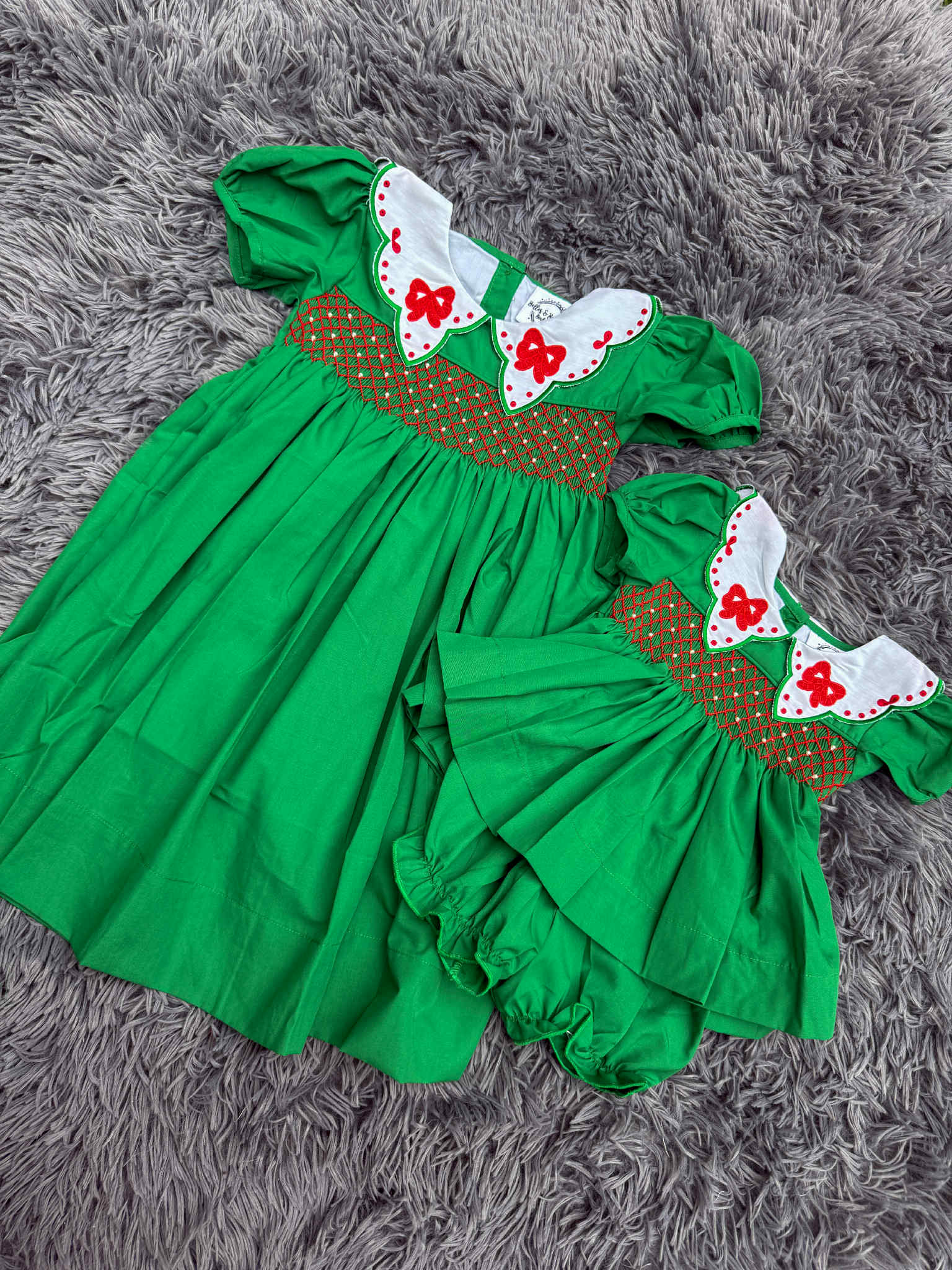 green smocked Christmas dress, pearl smocking, Christmas sibling outfits, toddler holiday dress, boutique Christmas clothing, Christmas bow collar dress, traditional Christmas baby outfit, holiday smocked dress, matching Christmas dress and bubble, children’s holiday heirloom outfit