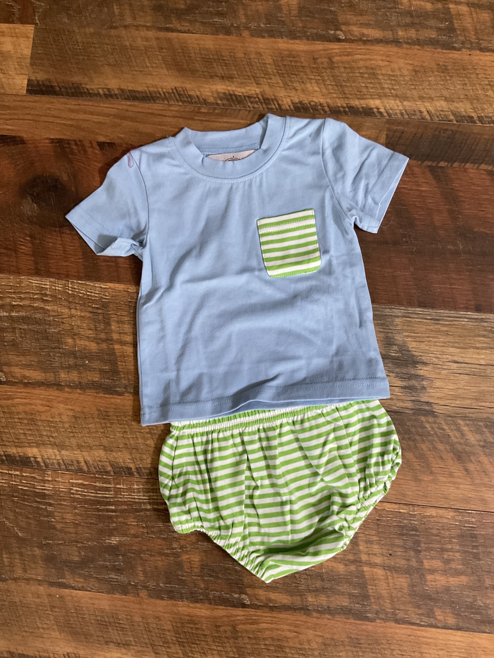 This sibling set is a perfect match for spring and summer fun. The boy diaper set and short set have a striped green pocket on the shirts to perfectly match the shorts pattern. The dress and girl bloomer set have a beautiful spring flower print with blue trim to match the boys shirt. Both have adjustable tie backs that make sizing very versatile.