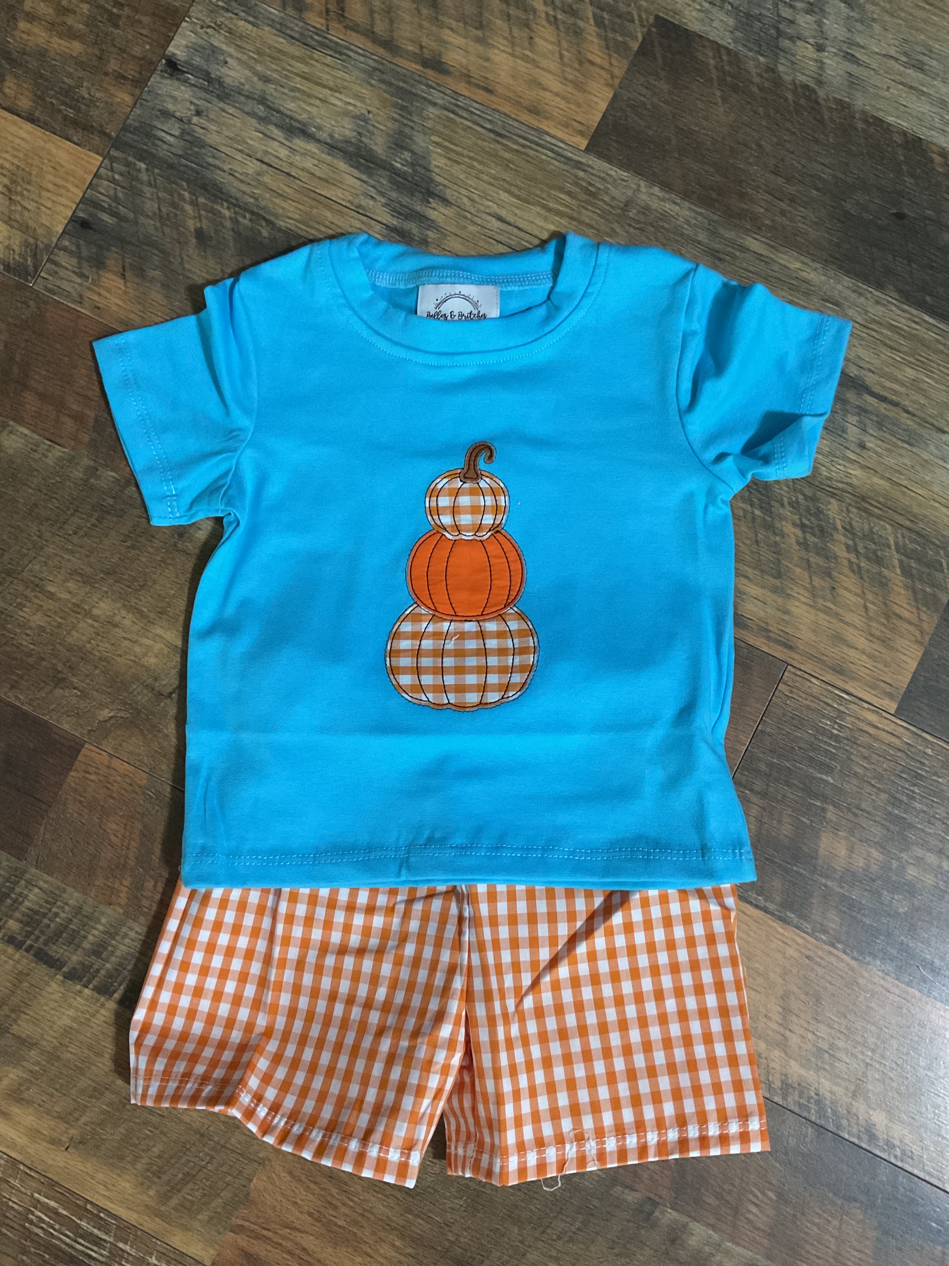 Get your little guy Stacked For Fall in this adorable short set! The blue shirt features three stacked pumpkins embroidered on the front, perfectly coordinated with the orange plaid shorts. The matching pumpkin detail ties the whole look together, making it a festive and comfy outfit for all his autumn adventures.