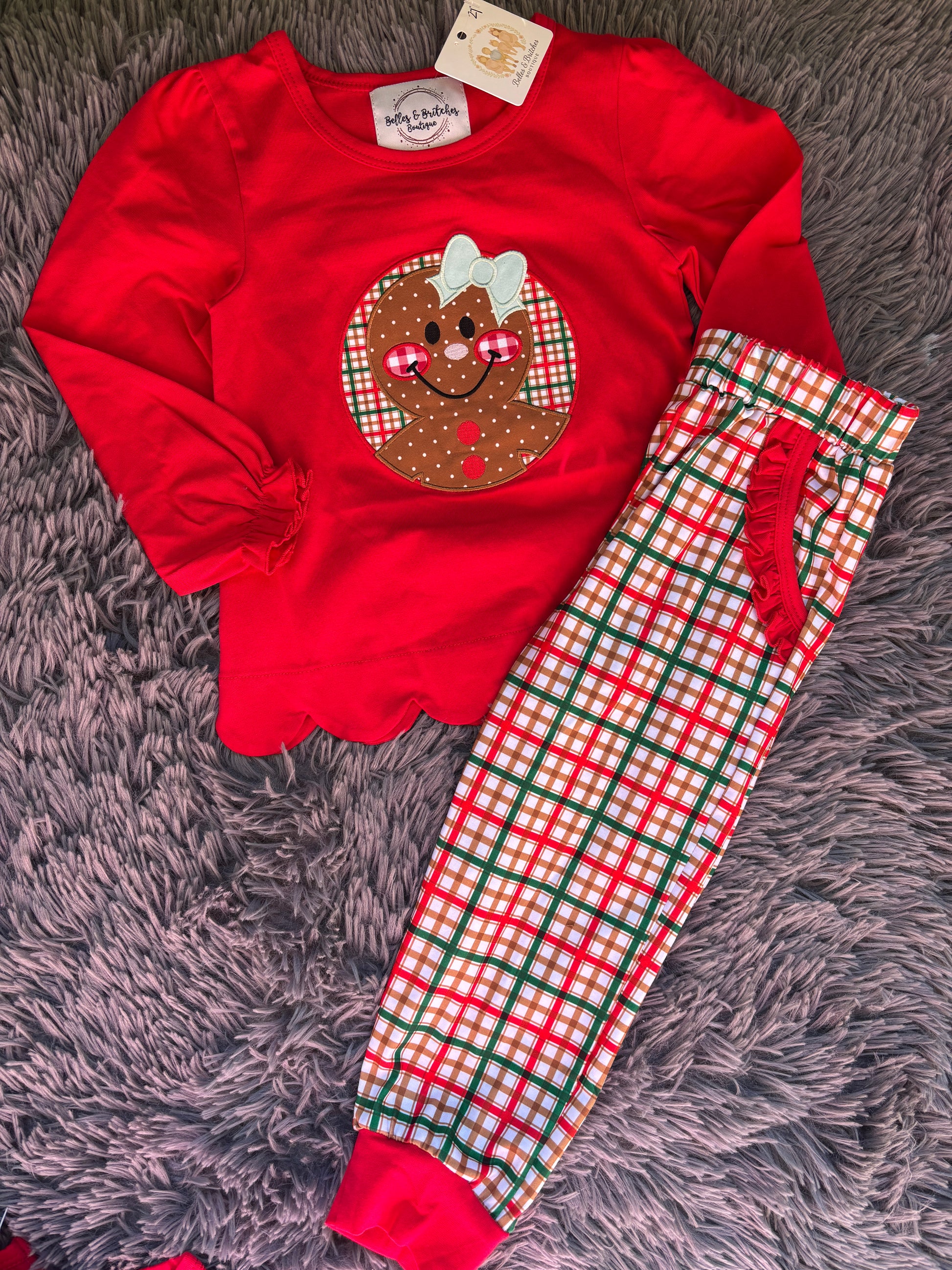 The Sugar & Spice Holiday Collection is the perfect mix of festive charm and classic style! This adorable collection includes a girl pant set, boy pant set, and girl bloomer set — all featuring red and green holiday plaid bottoms with front pockets for extra cuteness and comfort. The girls’ tops have a scalloped hem and a sweet appliqué gingerbread man finished with a bow, while the boys’ shirts feature the same cheerful gingerbread design. Long sleeves make these sets perfect for all your cozy holiday moments!